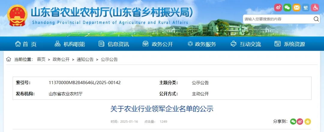 1月16日山东省农业农村厅网站发布《关于农业行业领军企业名单的公示》广东会贵宾厅 位列其中具体公示如下: